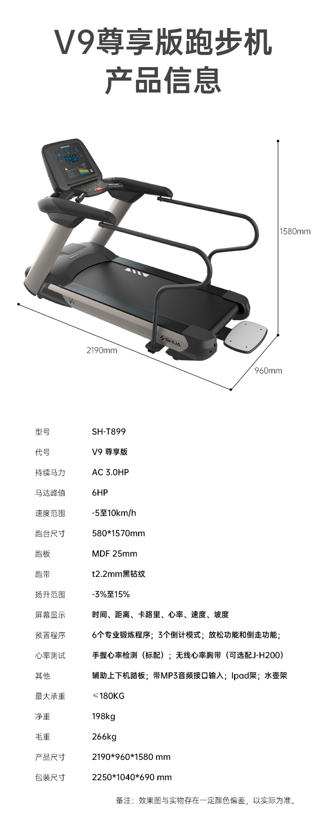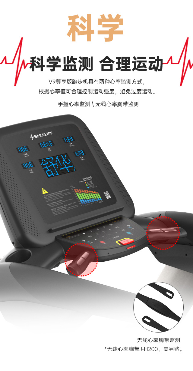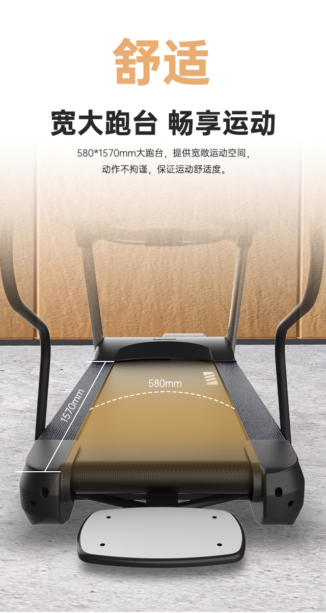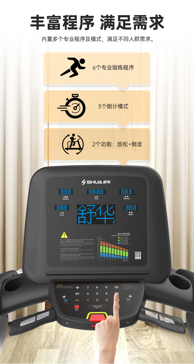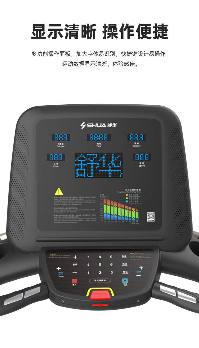 舒华多功能跑步机T56 SH-T5600-T2跑台尺寸是480×1200mm,持续马力是DC 1.5CHP(无刷电机)。